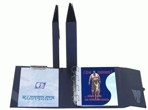 Fabricada en PVC de alta calidad. Con mecanismo de 4 anillas cromadas y pinza miniclip superior. Cierre mediante trabilla de PVC soldada a la carpeta. Plástico extra resistente.