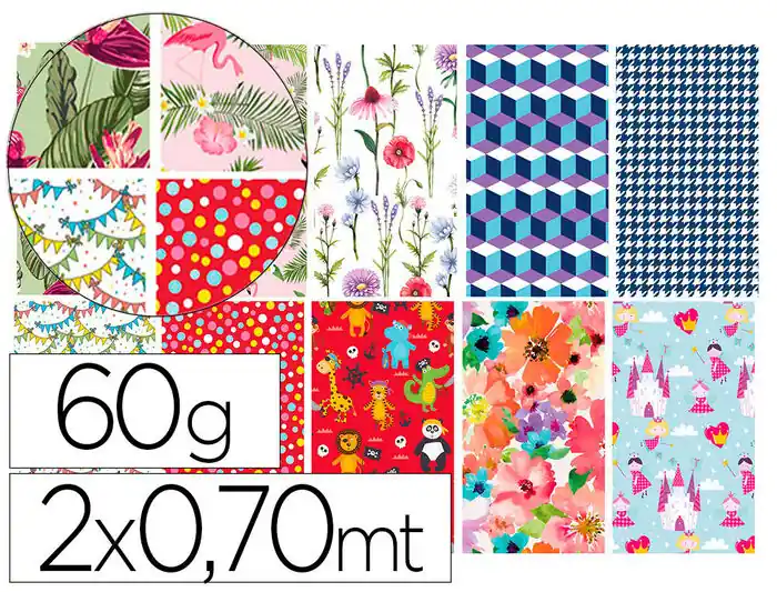 PAPEL DE REGALO DE FANTASIA PARA TODO EL AÃO. ROLLO DE 2 X 0,70 MT, DIAMETRO 30MM. PAPEL DE 60 GR. 10 MODELOS SURTIDOS, UN MODELO PARA CUALQUIER OCASIÃN.