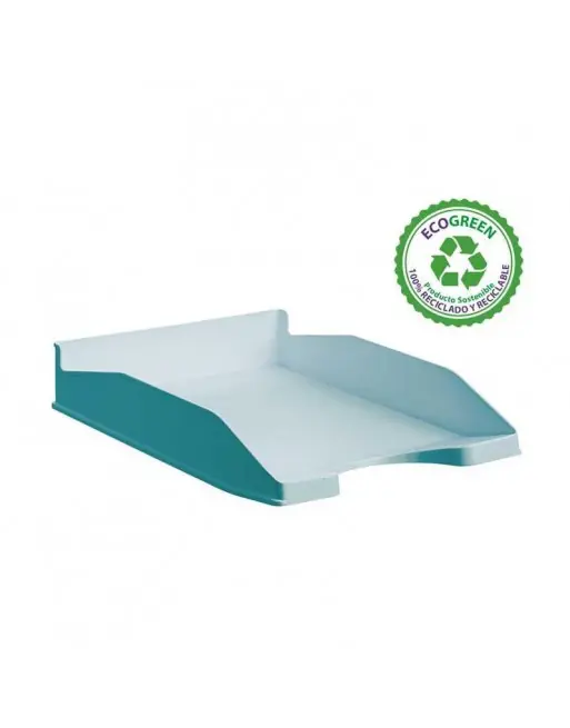 Bandeja organizadora Ecogreen, fabricada con materias primas 100% recicladas y reciclables, certificadas según la normativa europea EUCERPLAST que garantiza la procedencia y el origen. Para formatos A4 y folio. Apilable en tres posiciones, con hendidura frontal para facilitar el acceso a la documentación. Dimensiones: 34,5×25,5×6 cm.