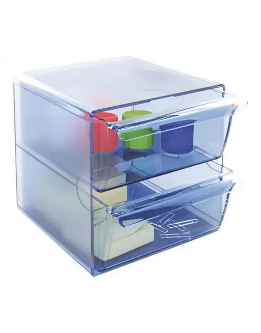 Organizador modular de armarios, estanterías, etCAJA Permite su uso individual o la creación de sistemas modulares. Gran ahorro de espacio. Posibilidad de 2 colores: azul transparente o cristal transparente.