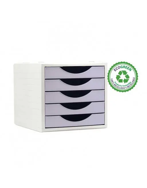 Módulo organizador Ecogreen, fabricado con materias primas 100% recicladas y reciclables, certificadas según la normativa europea EUCERPLAST que garantiza la procedencia y el origen. Módulo de 5 cajones en color pastel, con tope de seguridad y suave deslizamiento. Para formatos A4, folios y subcarpetas. Apilamiento perfecto y estable, con la simple colocación de un módulo sobre otro. Medidas interiores cajones: 32,3 x 23,4 x 3,8 cm. Dimensiones totales: 34x27x26 cm.