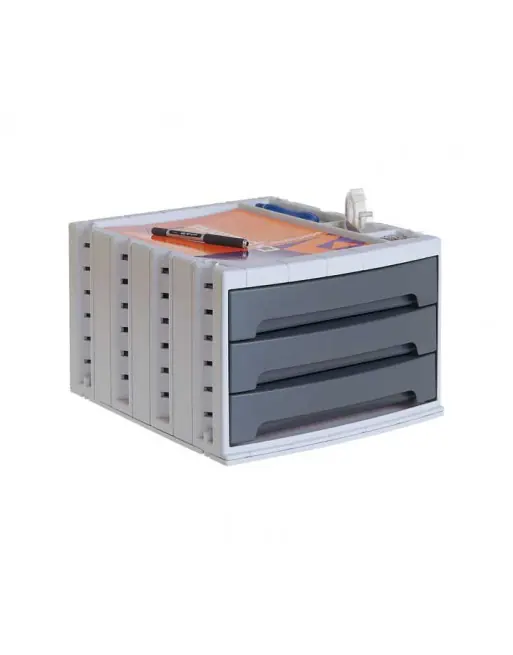 Archivador modular apilable con 3 cajones medianos. Los cajones tienen tope de seguridad y un suave deslizamiento. Válido para documentos A4 y folio. Apilables unos sobre otros con posibilidad de añadir ruedas. Cajones opacos. Bandeja organizadora superior con diferentes departamentos para clasificar material de oficina. Medidas: 370x305x215mm.