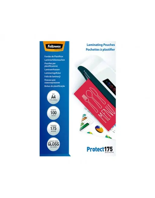 Fundas de plastificar Protect de 175 micras. Máxima calidad en la plastificación. Ideal para documentos como notas informativas, menús, listados y documentos utilizados habitualmente Acabado en brillo, tamaño A4. Pack de 100. Compatible con todas las plastificadoras.
