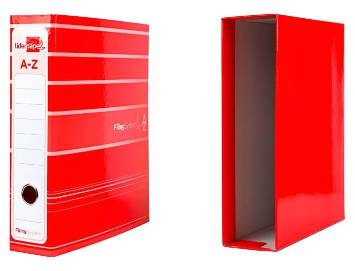 Archivador fabricado en cartón forrado de 1,9 mm de espesor, plastificado con caja. Mecanismo de palanca de 75 mm con ollao y compresor metálico. Ancho de lomo: 80 mm. Formato DIN A4. Medidas: 285 x 318 mm.