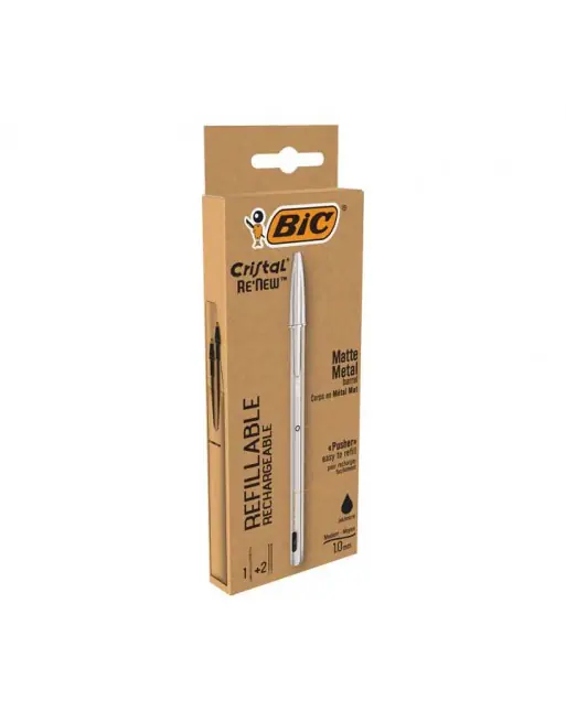 Bolígrafo con tinta base aceite. Capuchón ventilado. El icónico Cristal de siempre con un nuevo diseño elegante y moderno, con cuerpo metálico. Diámetro de bola: 1mm. Ancho de trazo: 0,4mm, para escribir al menos 2.000m. Fácilmente recargable. Cada pack incluye dos recargas.