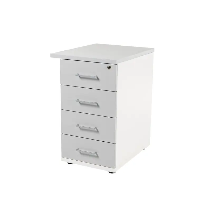Buck de 4 cajones. Con estructura de melamina de 19mm. con canto de PVC de 2 mm. Los interiores de los cajones son metálicos lacados, guías con rodamientos de nylon. Los tiradores son metálicos e incluye cerradura centralizada. Sistema antivuelco. Dimensiones: 47x74x60cm.