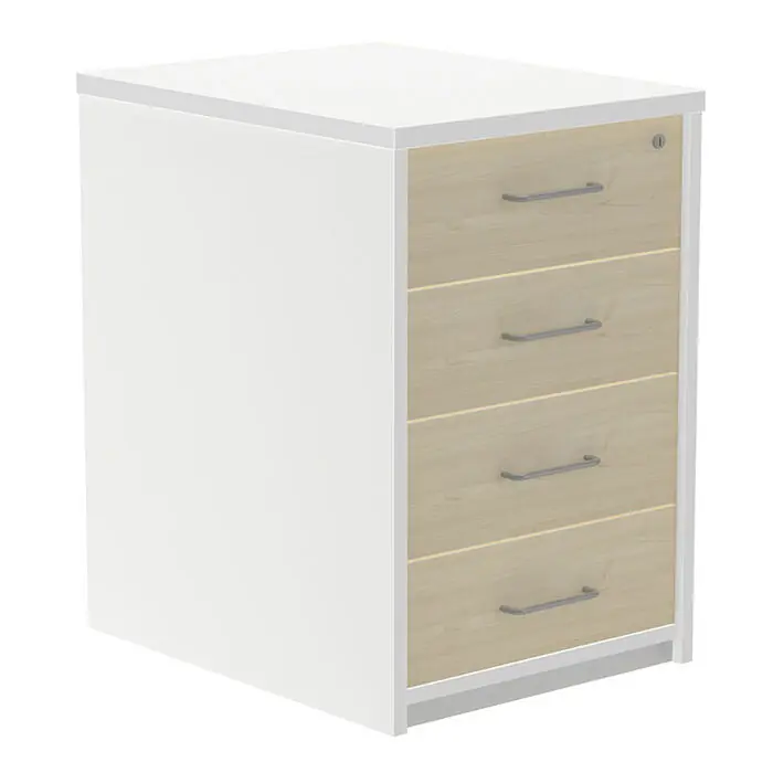 Estructura realizada en melamina de 19 mm en su totalidad. Cerradura con 2 llaves plegables. Sistema de cierre centralizado para la confidencialidad deseada. Sistema antivuelco. Tiradores metálicos. Cajones metálicos realizados en chapa de acero. Guías metálicas con rodamientos de nylon. Tiene 4 cajones. Medidas: 60 x 47 x 72 cm. Color de la estructura: blanco. Color de los cajones: haya.
