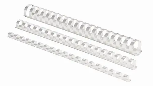 Canutillo de plástico cilíndrico que permite encuadernar documentos de hasta 45 hojas de forma manual, ya que se cierran sobre sí mismo por la mera presión del plástico.
