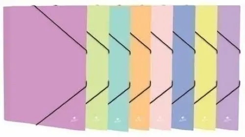 Carpeta de gomas y solapas fabricada en cartón forrado con papel plastificado mate, en colores pastel.