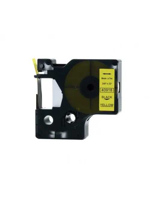 Cinta de rotular compatible con Dymo D1. Rollo de 7 metros de longitud por 9 mm de anchura. Letra color negro sobre fondo amarillo. Cinta adhesiva. Adecuado para todas las impresoras que aceptan una cinta D1 de 9 mm.