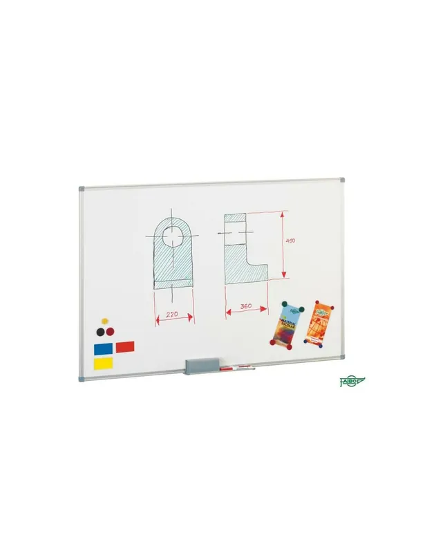 Pizarra blanca con marco de aluminio y cantoneras decorativas.