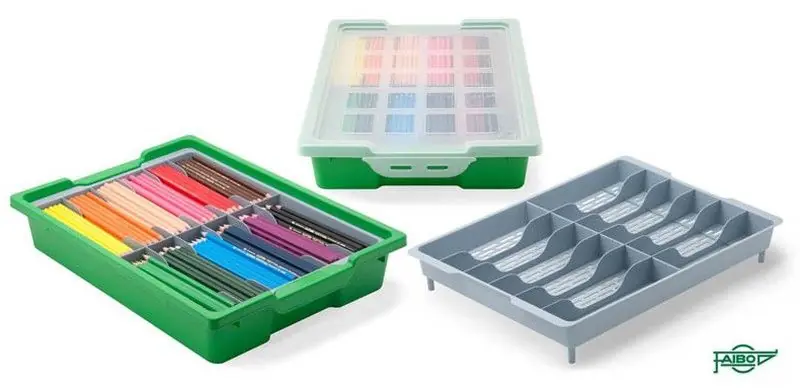 Fabricada en polipropileno. Muy resistente. Bandeja con 12 departamentos para clasificar: lápices, etc… Fabricada en plástico reciclado y reciclable.