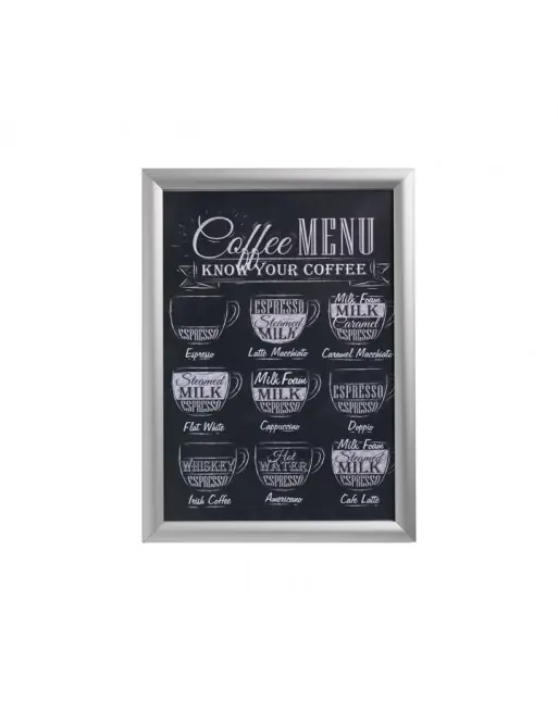 Marco de pared *Click Frame*, acabado en aluminio anodizado plata con panel trasero en estireno. El contenido se cambia fácilmente sin necesidad de retirar el marco de la pared. Incluye fijaciones para la pared y agujeros pre-perforados. Ideal para registro de datos e información en colegios, comercios, servicios…