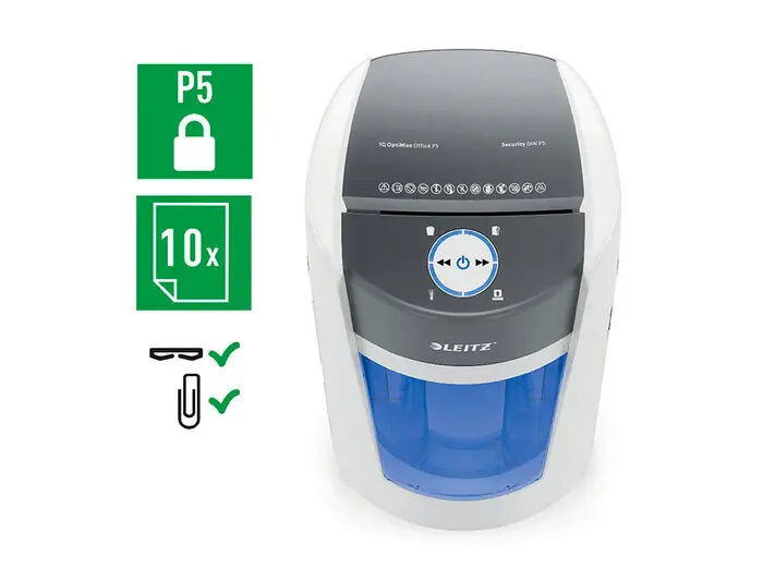 La destructora de documentos Leitz IQ OptiMax Office ofrece una solución de destrucción innovadora y elegante, al tiempo que garantiza una seguridady tranquilidad excepcionales. Esta destructora de papel DIN P5 de alta se guridad tritura sin esfuerzo hasta 10 hojas A4 a la vez en microcortes. LaIQ OptiMax incorpora la exclusiva tecnología de giro de papelera (BRT), q ue maximiza la capacidad en un +33%. La papelera giratoria garantiza una distribución plana y uniforme del papel para evitar que los trozos de papelformen un pico en la papelera, lo que permite triturar 140 hojas A4 adici onales antes de tener que vaciarla. BRT significa que no hay necesidad de sacar o agitar la papelera, el indicador de papelera llena solo se activa va cuando alcanza el 100% de su capacidad. La generosa papelera de 35 litros tiene capacidad para 550 hojas A4 y se ilumina en azul durante su uso para ofrecer la mejor experiencia de destrucción. La intuitiva pantalla LEDincluye indicaciones de advertencia en