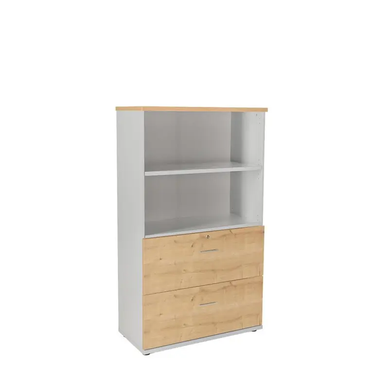 Armario de madera de líneas rectas. Estructura fabricada en melamina de 19mm. con cantos de PVC de 1mm. La parte trasera esta fabricada en DM de 3mm. Incluye baldas de 25mm. Armario carpetero con sistema de cierre, sistema antivuelco y tiradores metálicos. Admite todo tipo de carpetas gracias a su estructura regulable. Fondo: 45cm. Encaja perfectamente en cualquier espacio de trabajo y en el hogar. * El armario de medidas 78x90cm. solo contiene dos cajones carpeteros.