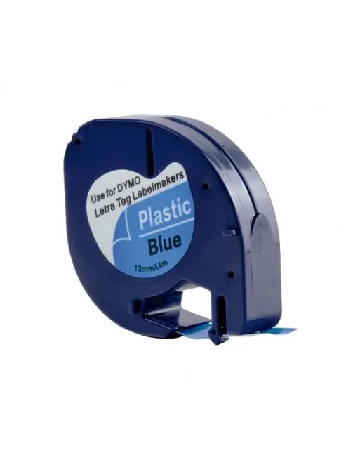 Cinta de rotular compatible con Dymo. Rollo de 4 metros de longitud por 12 mm de anchura. Letra color negro sobre fondo azul. Cinta adhesiva con una separación fácil de retirar. Compatible con todos los modelos de Dymo LetraTag.