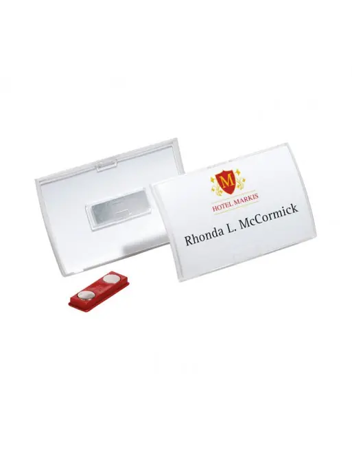 Portanombres plegable de polipropileno con etiquetas en blanco y sujeción de imán. La bisagra flexible que une la parte delantera y trasera permite una fácil y rápida inserción y extracción de la etiqueta. No recomendado para personas con marcapasos. Medidas interiores: 54 x 90 mm (Al x An).