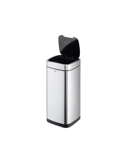 Papelera para uso sin contacto. La apertura funciona con sensor de movimiento y el cierre es automático. Tiene la posibilidad de uso manual con botones de Abrir/Cerrar. Recipiente interior extraíble con asa y fijación para la bolsa, tapa extraíble para un fácil vaciado. Cuerpo de acero inoxidable con recubrimiento antihuellas y base antideslizante y forma cuadrada para ahorrar espacio. Funciona con 4 pilas AA (no incluidas). Capacidad: 35 litros.