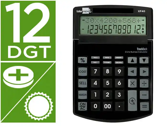 Calculadora de sobremesa de 12 dígitos. Fabricada con un 40% en plástico reciclado, respetuosa con el Medioambiente. Pantalla reclinable de doble línea. Con función Trackback. Teclas de coste, ventas y margen de beneficio.Tecla de cálculo de impuestos. Tecla de doble cero. Tecla de inserción y borrado. Elegante frontal metálico de color negro. Teclas de plástico. Pulsación de rápida respuesta. Autoapagado. Medidas 175x120x30 mm. Solar y piLAS