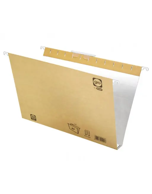 Kraft bicolor de 240 g. Visor superior corto de 8 cm. Varilla de acero. Distancia ejes A4: 330 mm. Distancia ejes folio: 365 mm. Distancia ejes folio prolongado: 390 mm. Incluye 25 visores rígidos y etiquetas.