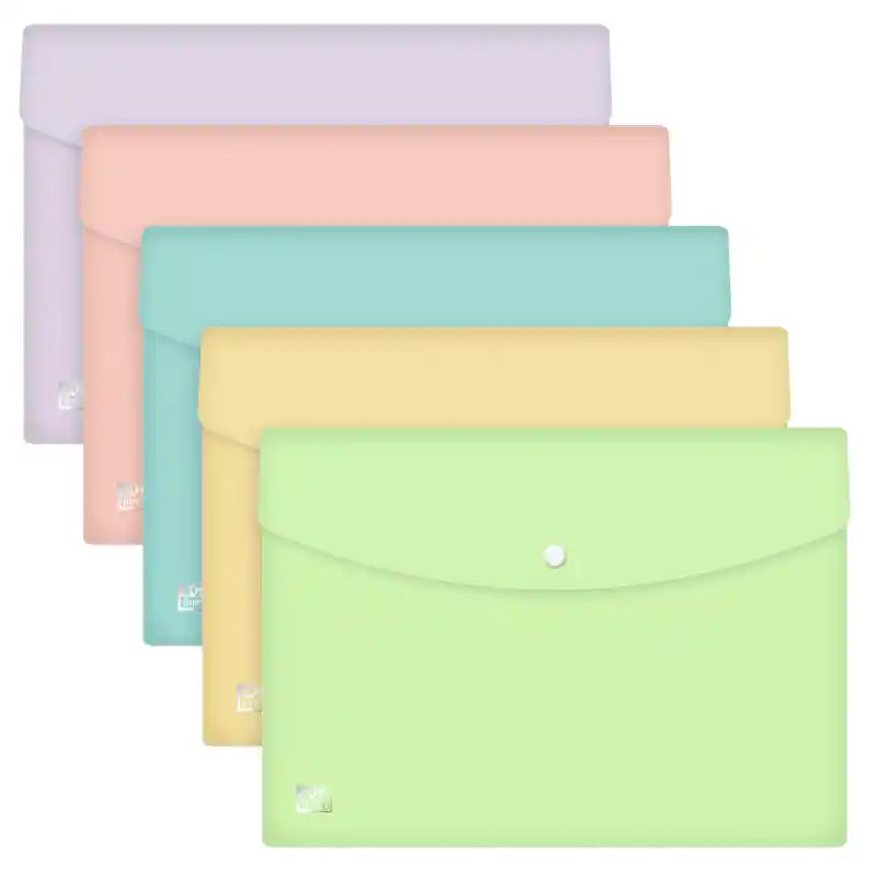 Sobres de plástico translúcido flexible. Cierre con broche y capacidad de hasta 40 hojas. Formato A4. Pack 5 sobres colores pastel.