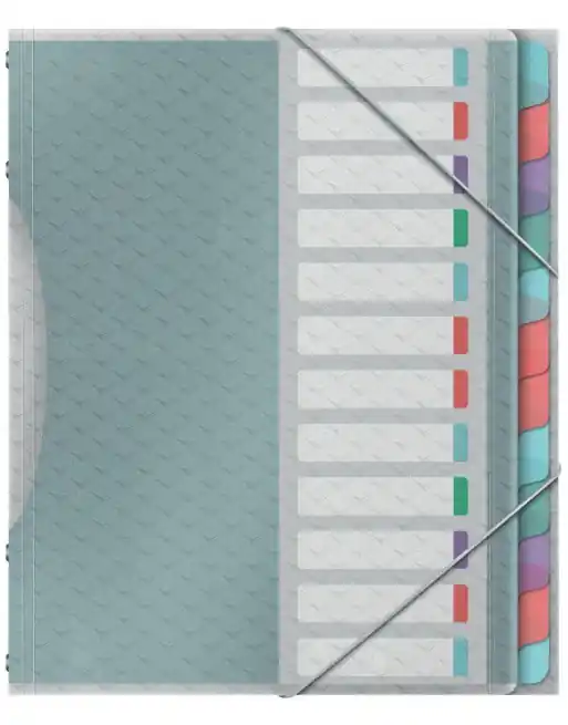 Carpeta clasificadora formato A4, para organizar proyectos y trabajos o guardar documentos de consulta frecuente. Organiza los documentos en los 12 separadores y guarda los papeles sueltos en las 3 solapas de la contraportada. Hoja frontal extraíble para etiquetar claramente las pestañas, lo que hace que las búsquedas sean rápidas y sencillas. El cierre con goma fácil de usar mantiene el clasificador protegido y evita que el contenido se caiga. Material libre de ácido y copy safe para mantener tus documentos en perfecto estado. Fabricado en polipropileno.