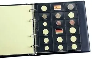 Fundas transparentes con alma opaca negra. Con cartulina separadora. Medidas: 186 x 210 mm. 16 alojamientos para monedas + 2 alojamientos para banderas.