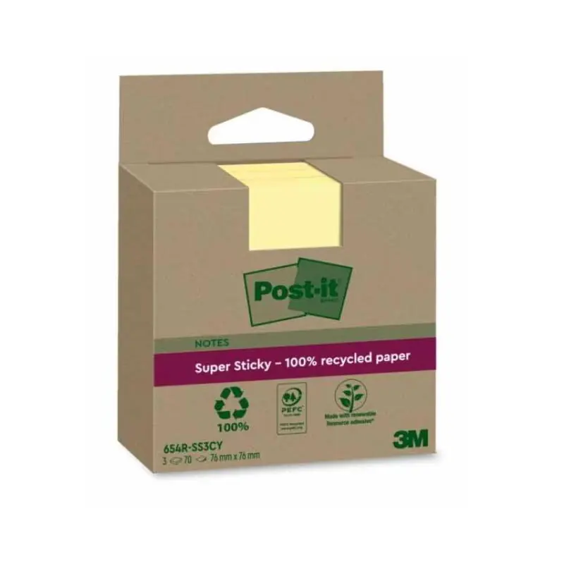 ¡Tus notas adhesivas favoritas ahora 100% recicladas! Las notas adhesivas Post-it® Super Sticky 76x76mm están fabricadas con papel reciclado para durar más y resistir mejor. Estas notas reposicionables son perfectas para situaciones de difícil adherencia como monitores de ordenador, puertas y paredes.