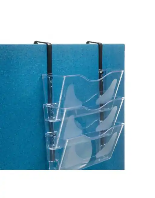 Porta-documentos mural con 3 bandejas formato A4. Ideal para mamparas y tabiques separadores. Incluye soportes para colgar. Dimensiones: 390 x 510 x 105 mm.