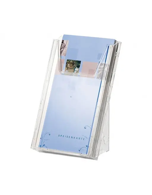 Dispensador de folletos. Se puede utilizar como expositor de sobremesa o de pared con solo girar los adapatadores 180º. Ampliable y combinable.