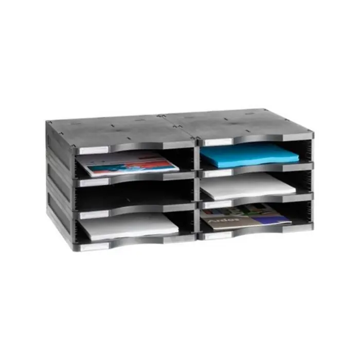 Estructura modular de gran capacidad, ideal para clasificar todo tipo de documentación de forma ágil, rápida y en el menor espacio. Fabricación española.Fabricado en poliestireno 100% reciclado y reciclable, certificado según la normativa europea EUCERPLAST. Válido para formatos A4 y folio. Permite crear diferentes alturas y construcciones mediante el uso de ampliaciones Estándar o ampliaciones de gran capacidad Jumbo. Accesorios opcionales de cajones con frontales de colores intercambiables y separadores. Número de casillas: 6. Medidas: 600 x 240 x 360 mm.