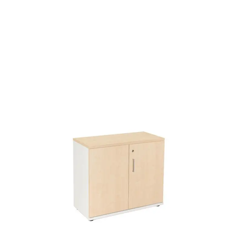Armario de madera de líneas rectas. Estructura fabricada en melamina de 19mm. con cantos de PVC de 1mm. La parte trasera esta fabricada en DM de 3mm. Incluye baldas de 25mm. Armario con almacenaje con puertas batientes. Con sistema de cierre con llave, sistema antivuelco y tiradores metálicos. Admite todo tipo de carpetas gracias a su estructura regulable. Fondo: 45cm. Encaja perfectamente en cualquier espacio de trabajo y en el hogar.