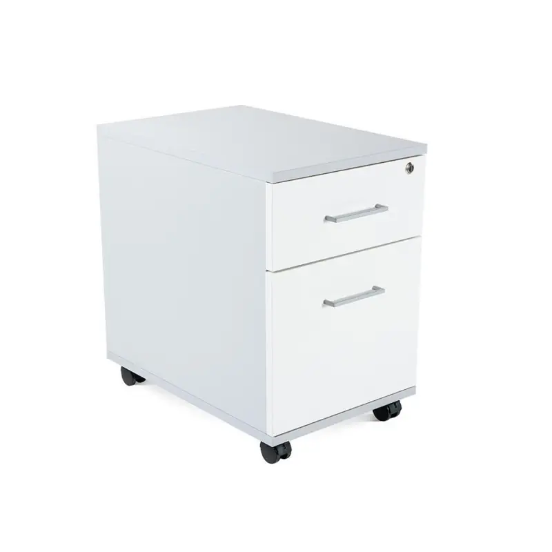 Buck móvil de 1 cajón y 1 cajón para carpetas colgantes. Con estructura de melamina de 19mm. con canto de PVC de 2 mm. Los interiores de los cajones son metálicos lacados, guías con rodamientos de nylon. Los tiradores son metálicos e incluye cerradura centralizada. Sistema antivuelco y ruedas con freno. Cajón para carpetas colgantes en formato A4. Dimensiones: 40x60x58cm.