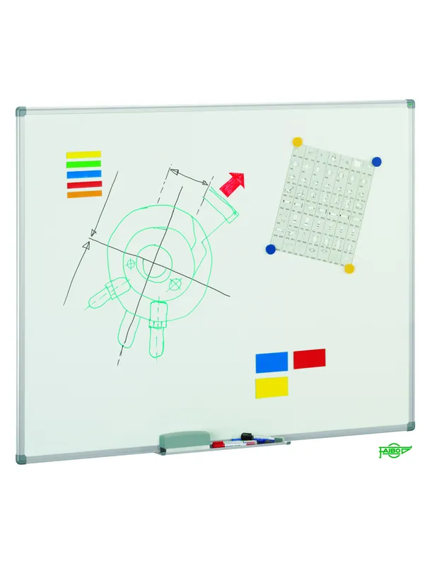 Pizarra blanca con marco de aluminio y cantoneras decorativas.