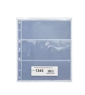 Fundas transparentes para coleccionar todo tipo de billetes. Plástico especial neutro inalterable y de duración prácticamente ilimitada. 3 departamentos. Medidas: 207 x 237 mm.
