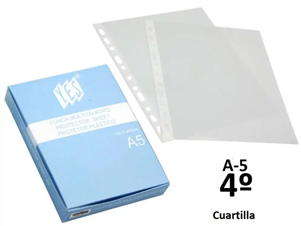 Fundas de plástico polipropileno multitaladro con refuerzo blanco, transparentes y acabado cristal. Grosor 70 micras. Tamaño Din-A5. Tratamiento antiestático y antirreflectante, para una mejor calidad y transparencia.