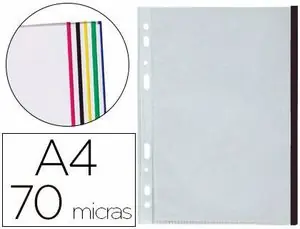 Funda para la protección y archivo de documentos. Con borde de color que ayuda a clasificar y distinguir la información. Fabricada en polipropileno cristal liso. 8 taladros. Grosor: 70 micras. Colores: amarillo, azul, negro, rojo y verde. Formato DIN A4. La bolsa de 10 unidades.