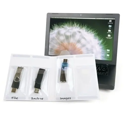 Bolsillo antiestático de polipropileno de 120µ con dorso adhesivo y solapa protectora. Organice, traslade, encuentre y proteja del polvo y de la suciedad sus USB.