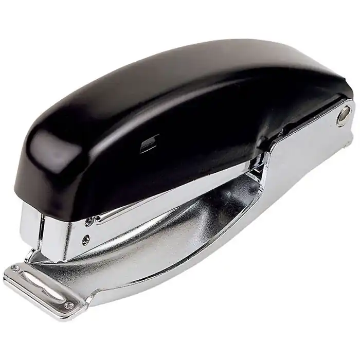 Grapadora de mano. Especial para la industria y la agricultura. Empuñadura de plástico ABS. Interior y base metálica. Capacidad para 75 grapas. Capacidad de grapado: 20 hojas para papel 80 g. Color: negro / cromado. Tipo de grapas: 22/6 y 24/6. La única grapadora tamaño mini con grapa 22/6.