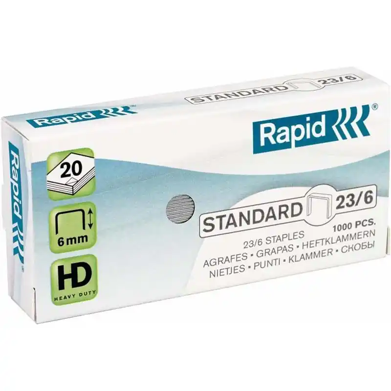 Organiza tus documentos con las grapas Rapid Standard, en tamaño 23/6 galvanizadas y un paquete de 1000 unidades para una sujeción fiable y duradera.