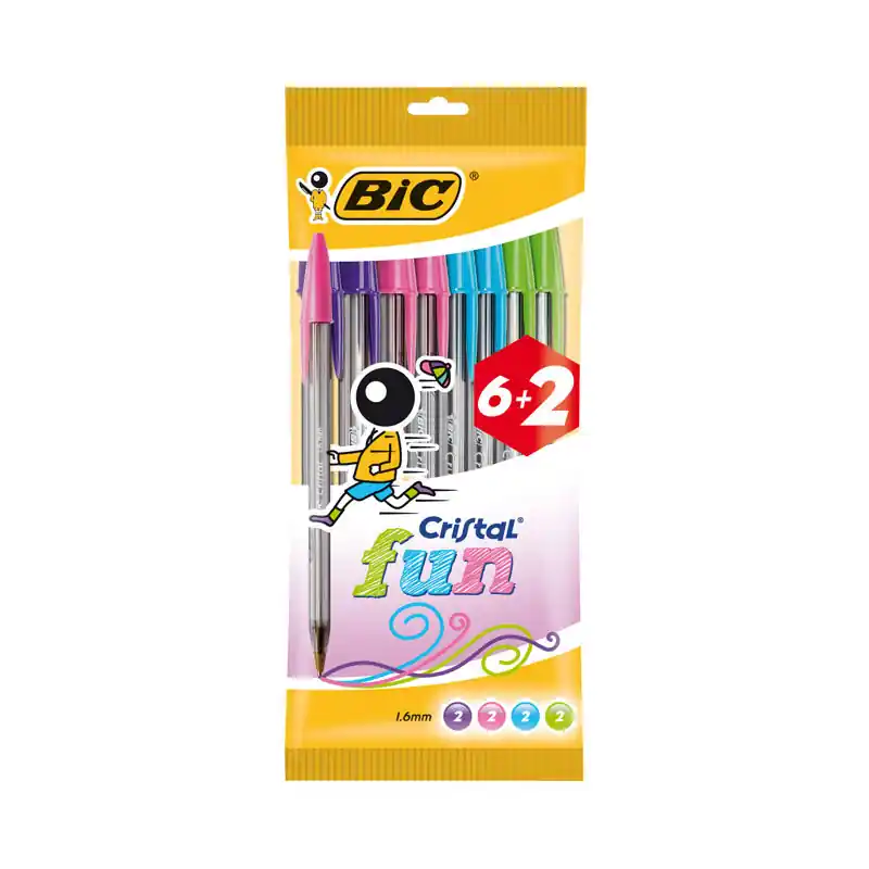 Escribe tus apuntes con estilo con los 8 Bolígrafos BIC Cristal Fun. El trazo de 0,60 mm. te ayudará a obtener un resultado profesional. Estos bolígrafos ofrecen una escritura suave, fluida y sin manchas. Su tinta a base de aceite resiste a los borrones para que tus notas se mantengan limpias y legibles. El tapón ventilado mantiene la tinta fresca y evita que se seque.