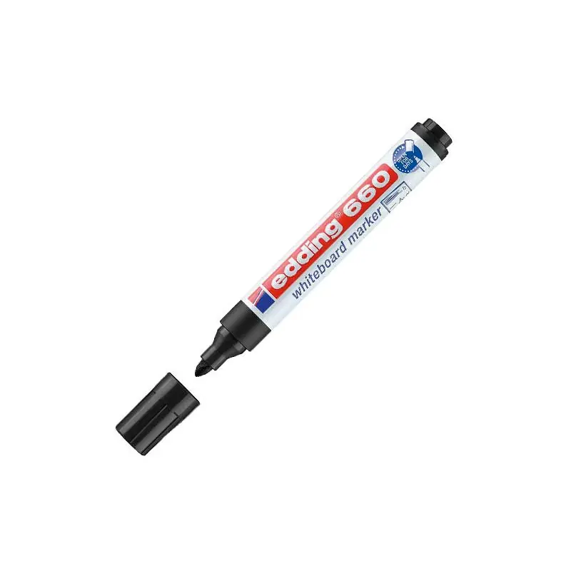 Si quieres un marcador para escribir y dibujar sobre pizarras blancas, no lo pienses más y compra el Marcador para Pizarras Blancas Edding 660. Con la tecnología «Cap off» podrás dejar el marcador destapado sin que se seque por varios días. Además, es rellenable así que podrás usarlo por mucho tiempo. ¡Escribe y dibuja con calidad y comodidad con el Marcador para Pizarras Blancas Edding 660!