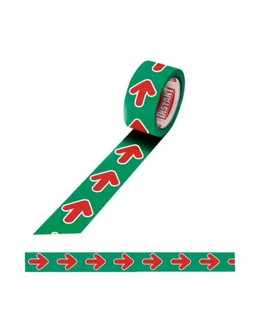 Cinta adhesiva flechas para señalizar. Fabricada en PVC a prueba de rotura. Con impresión en color a prueba de luz. No reflectante. Longitud del rollo: 50 m. Anchura del rollo: 48 mm.