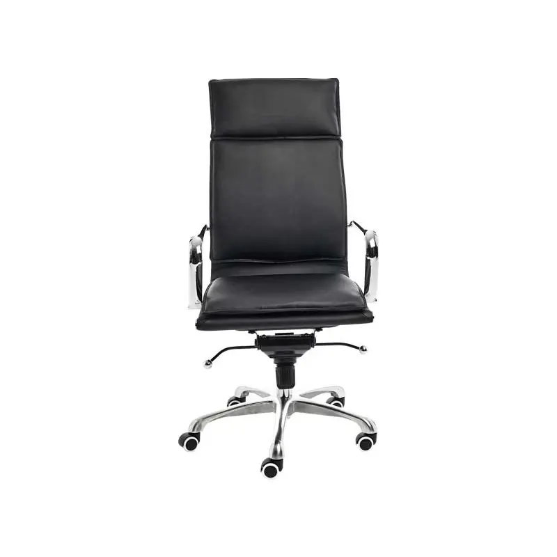 Silla de dirección con asiento y respaldo acolchados en espuma tapizado en símil piel. Estructura metálica y cromada con mecanismo de regulación del altura en acero. Regulación de altura mediante pistón de gas de fácil activación. Regulación del respaldo basculante. Brazos fijos fabricados cromados. Base piramidal metálica con ruedas especial parqué. Alto asiento: 51/56cm