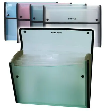 Polipropileno (PP) transparente rayado, formato DIN A4, con 12 departamentos, etiquetas, visores y cierre con doble botón, perfil de tela en color negro. Medidas: 330 x 240 x 30 mm, grosor de la tapa 0,7 mm.