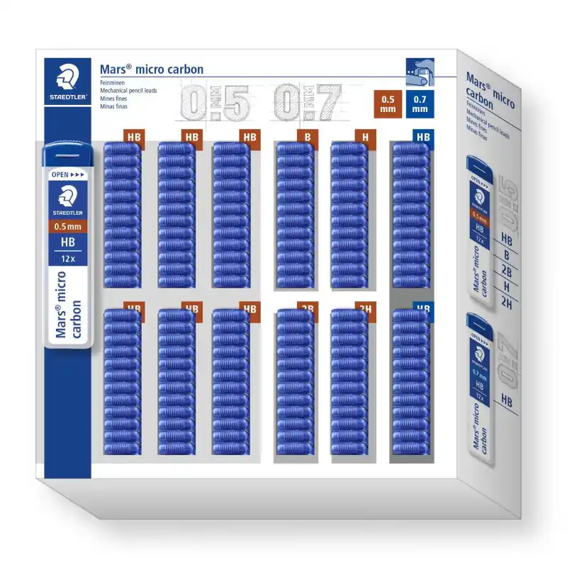 ¡Este expositor 144 tubos de lápiz de mina Staedtler Mars Carbon contiene todo lo que necesitas para dibujar en papel y cartulina! Está compuesto por 72 tubos de lápiz HB, 12 tubos de lápiz B, 12 tubos de lápiz 2B, 12 tubos de lápiz H, 12 tubos de lápiz 2H y 24 tubos de lápiz 0,7 HB de la marca Staedtler Mars Carbon.