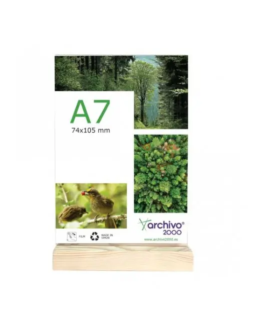 Expositor de sobremesa sostenible Archivo 2000 doble cara vertical con base de madera. Formato vertical. Fabricado en metacrilato ultra transparente y resistente. Base de madera con acabado lijado y canal pasante, ranura anticaída adaptada a cada formato para una mayor seguridad del documento. Tamaño de la madera 30x75x20 mm. Medidas exteriores: 30x75x125 mm. Fabricado en España.