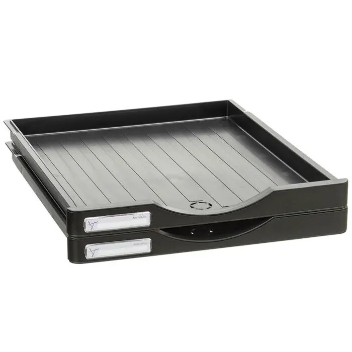 Pack 2 cajones pequeños Archivodoc. Todos los frontales de los cajones son intercambiables e incluyen un tarjetero identificador. Color cajón: negro. Medidas interiores: 322 x 265 x 22 mm. Permite clasificar todo tipo de documentación de forma ágil, rápida y en el menor espacio. Fabricación española.Válido para formatos A4 y Folio. Dimensiones: 295 x 27 x 345 mm.