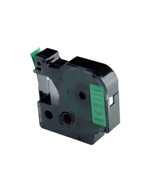 Cinta de rotular compatible con Dymo D1. Rollo de 7 metros de longitud por 12 mm de anchura. Letra color negro sobre fondo verde. Cinta adhesiva. Compatible con todos los modelos de Dymo D1.