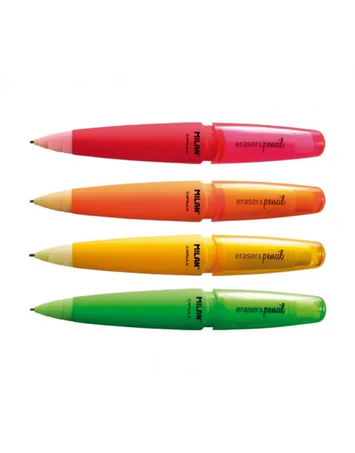 Portaminas eraseramp,pencil CAPSULE Fluo. Mina de grafito 1,3 mm dureza 2B, gruesa y suave, que ofrece un trazo similar a los lápices de madera tradicionales. Goma MILAN extra-grande. Gomas y minas de recambio disponibles. Medidas portaminas CAPSULE: 13 x 1,8 x 1,6 cm.